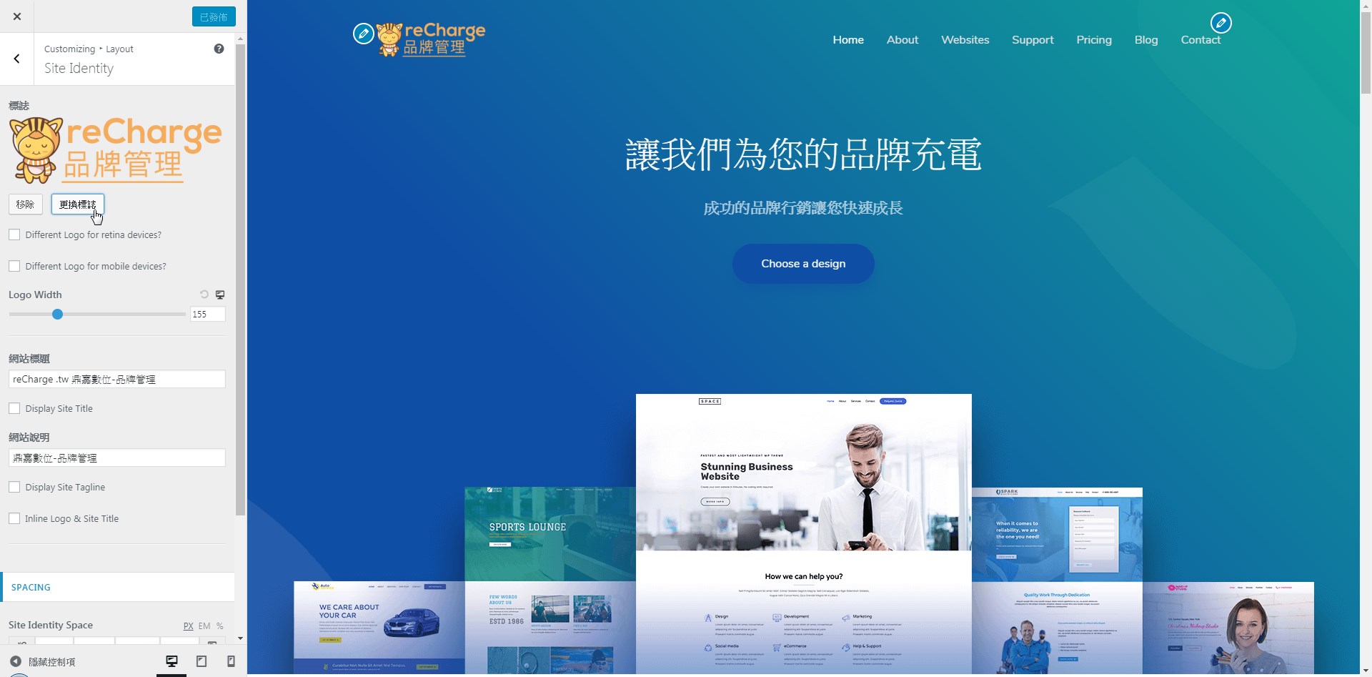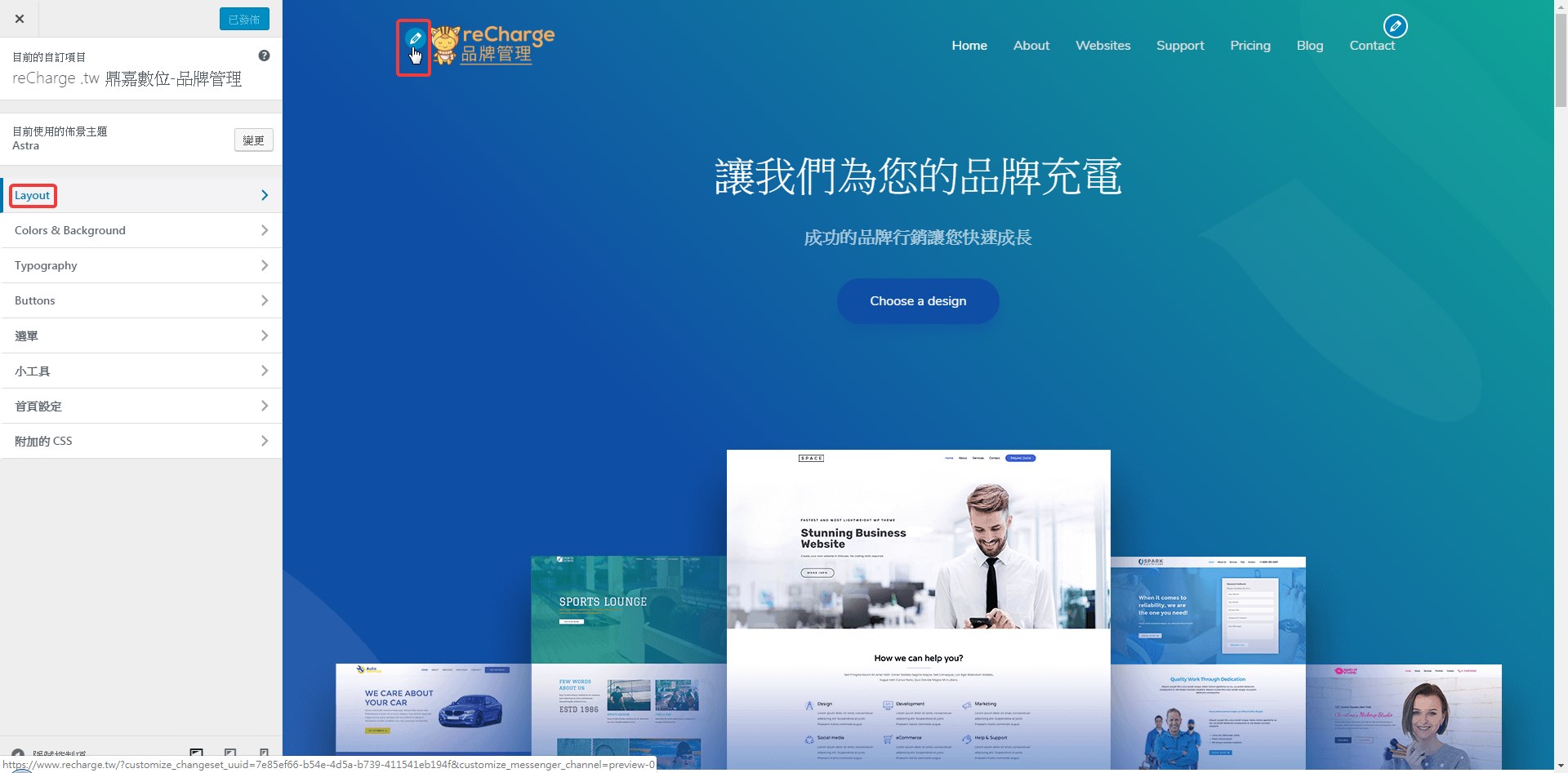 2.  點選  Logo 左邊的【小鉛筆編輯按鈕】,或是點選【Layout】→【Header】【Site Identity】